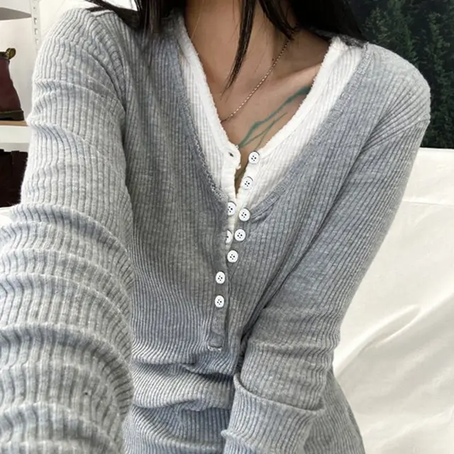 Product information: Pattern: color matching Color: dark blue, light gray Size: S,M,L Version: Regular Style type: Street hipster Popular elements: color matching buttons Style: False two-piece suit Fabric name: Rib Sleeve type: regular sleeve Main fabric composition: Polyester (polyester fiber) Length: ordinary (50cm Sleeve length: long sleeve Style: European and American style Craft: collage/stitching Note: 1. Asian sizes are 1 to 2 sizes smaller than European and American people. Choose the larger size if your size between two sizes. differences due to . 2. Please check the size chart carefully before you buy the item, if you don't know how to choose size, please contact our customer service. 3.As you know, the different computers display colors differently, the color of the actual item may vary slightly from the following images. Packing list: Top*1 Product Image:
