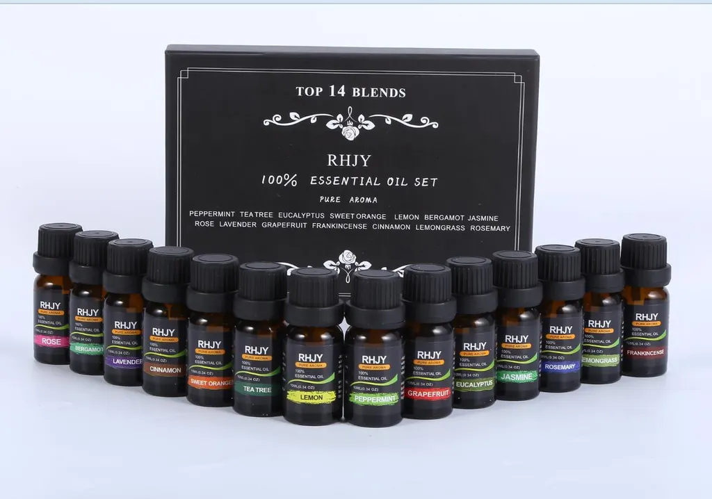 Fragrance A total of 14 flavors; rose lemon cinnamon frankincense jasmine bergamot grapefruit rosemary eucalyptus tea tree lemon grass sweet orange mint lavender Set of essential oils 100% purity 14 bottles per set * 14 different flavors * 10ml 14 flavors per set, well equipped