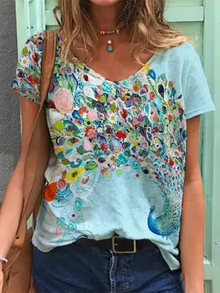 Asuka Print V-neck Short-sleeved T-shirt - 2