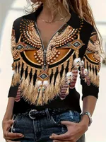 Autumn And Winter Lapel Zipper Long Sleeve Printed T-shirt - Dark