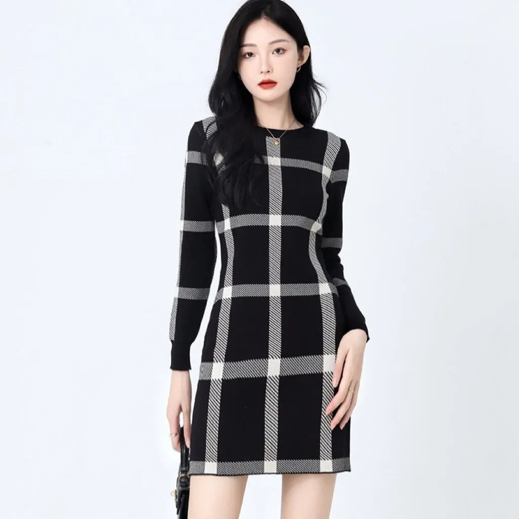 Autumn And Winter Plaid Knit Dress Base Skirt -