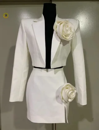 Autumn High-grade V-neck Three-dimensional Flowers Suit - White