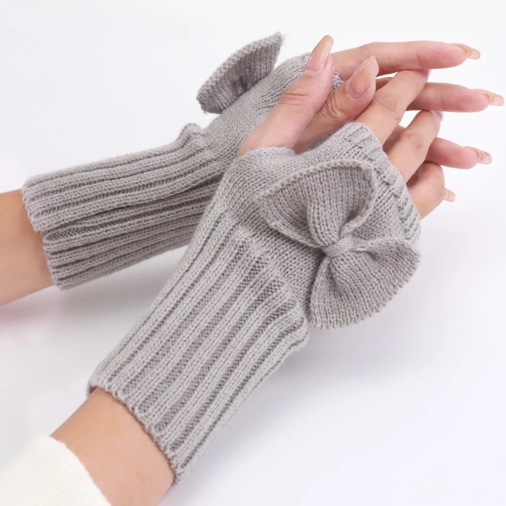 Bow Knitted Wool Keep Warm Half Finger Fingerless Gloves - Light Gray