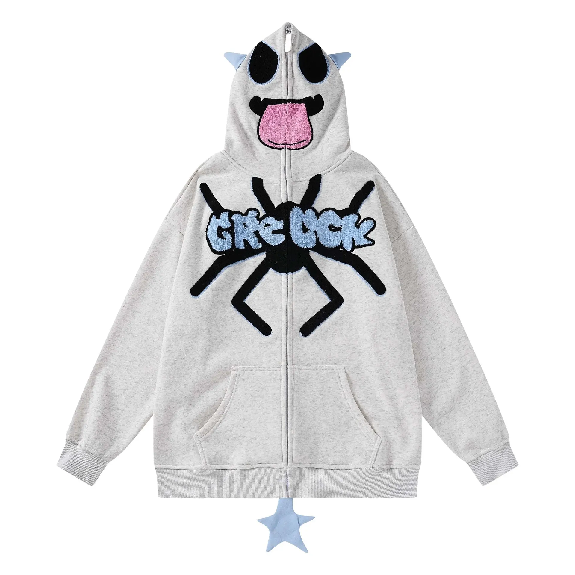 Cartoon Spider Letter Towel Embroidery Hooded Cardigan Sweater - Gray
