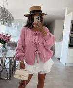 Knitted Bow Lace Up Cardigan Solid O-neck Short