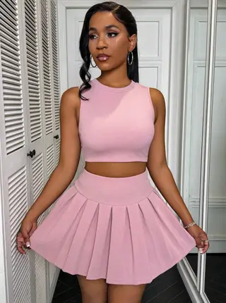 Solid Color Round Neck Vest Short Skirt Set - Pink
