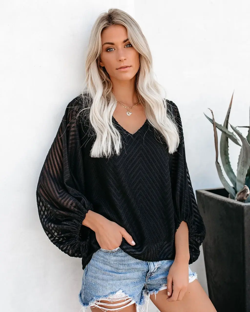 Chiffon Shirt V-neck Lantern Sleeve Pullover - Black