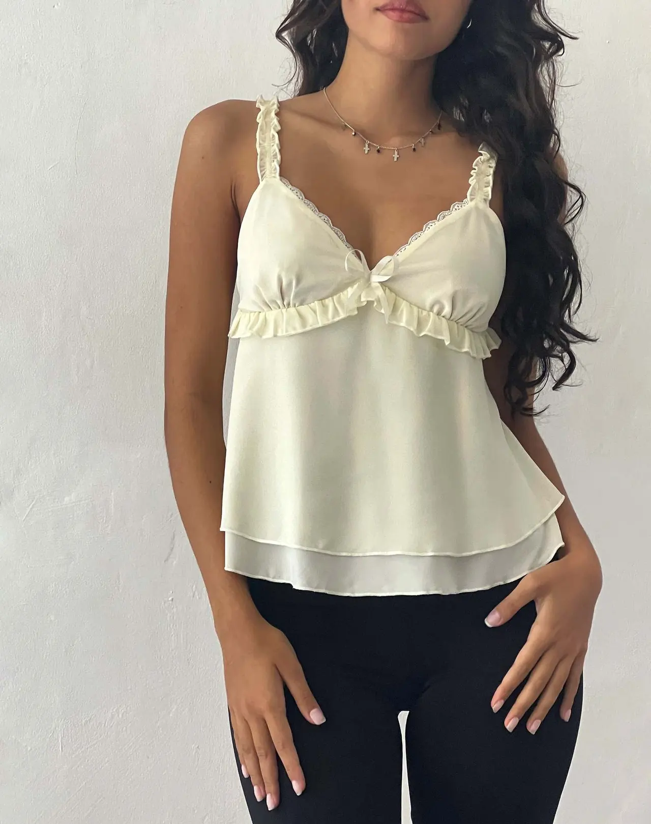 Chiffon Stitching Lace Pleating Sling Top - Apricot