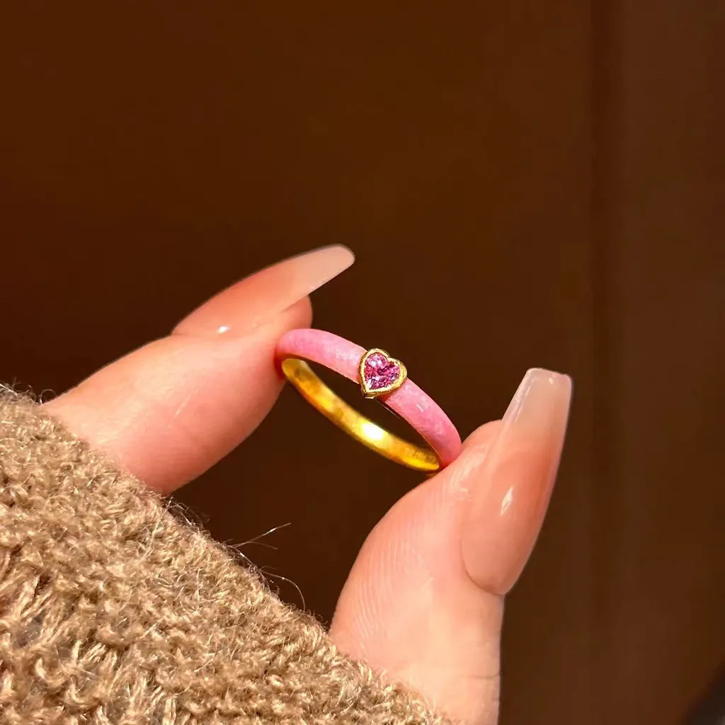 Dopamine Color Zircon Enamel Ring - Pink Heart Spot Drill