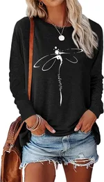 Dragonfly Pattern Round Neck Long Sleeve T-shirt Tops - Black