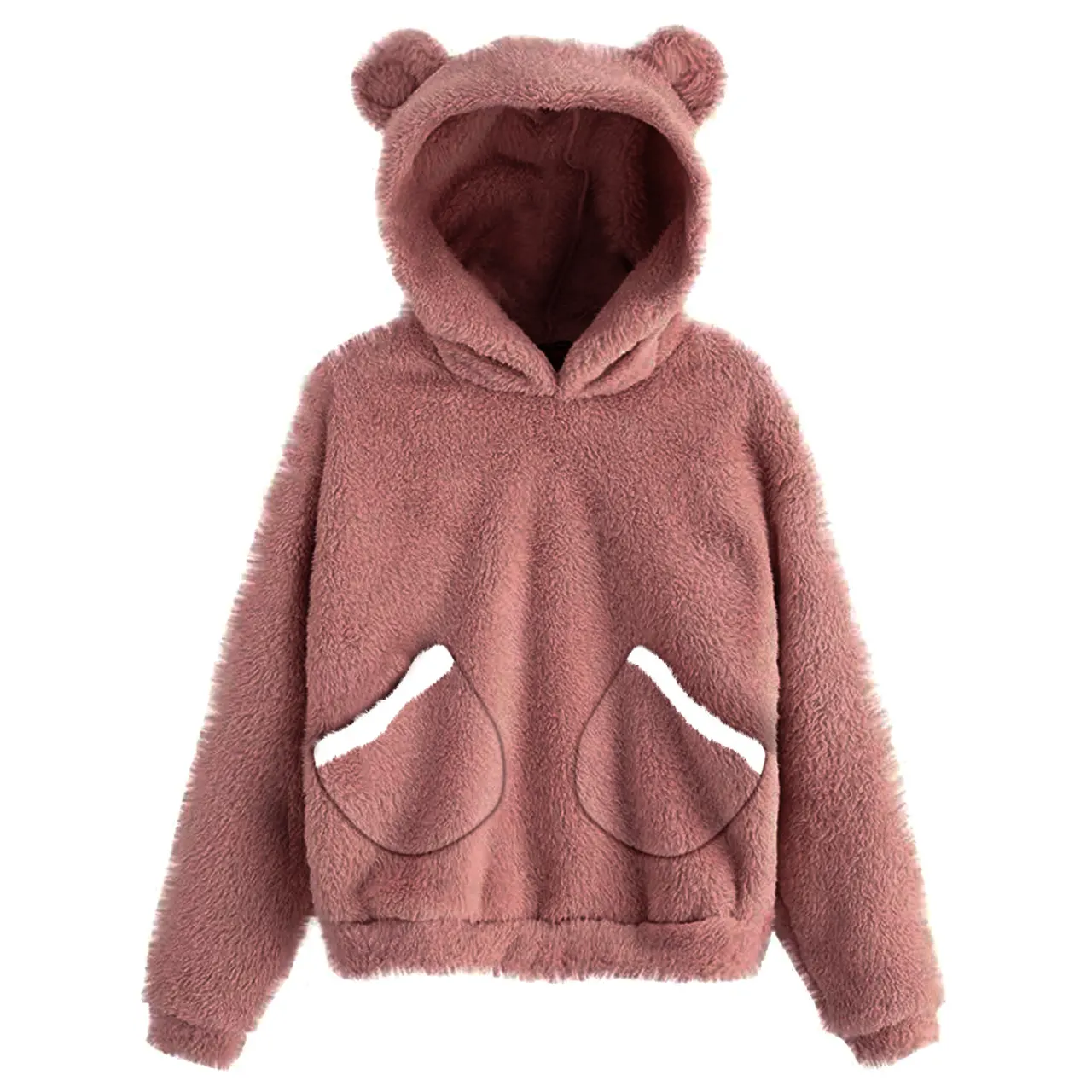 Pocket Plush Rabbit Ears Hooded Warm Sweater Jacket - Skin Pink