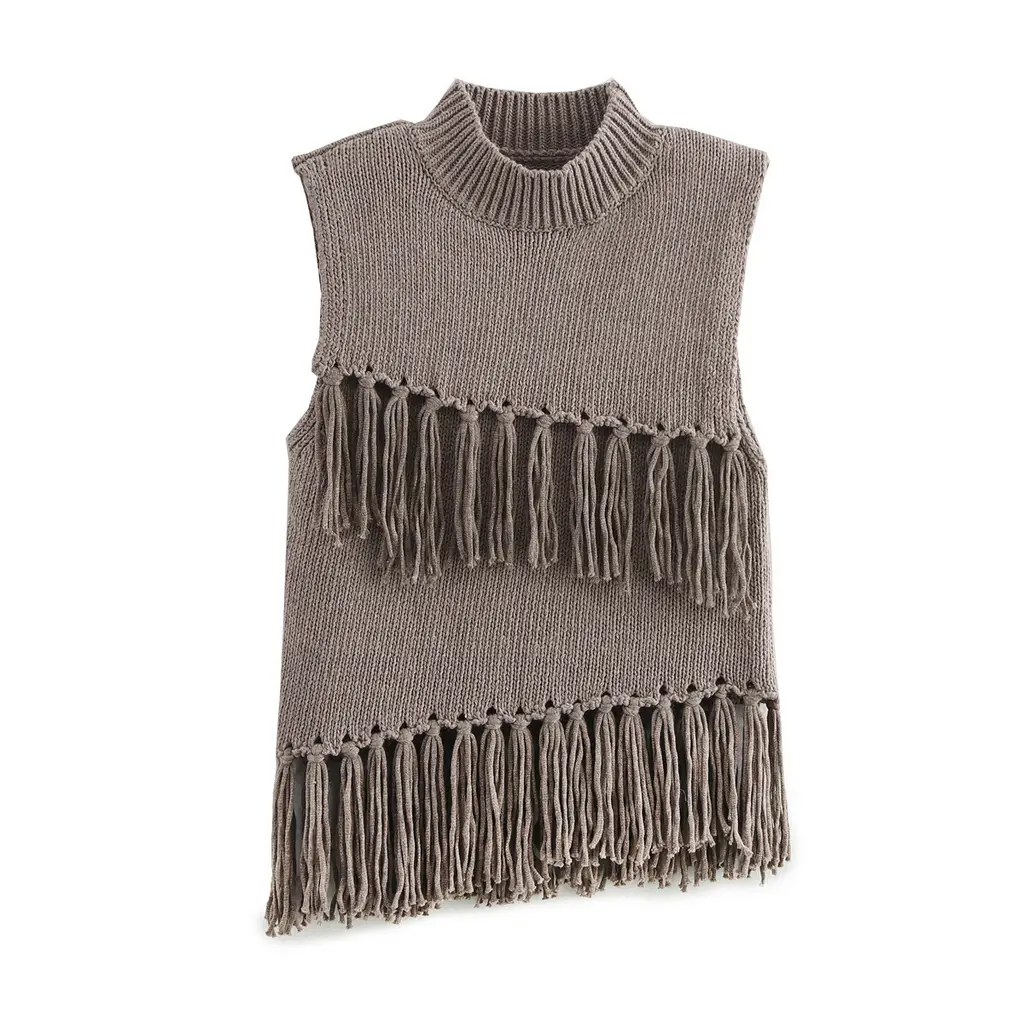 Leisure Stand Collar Sleeveless Short Decorated Tassel Knitted