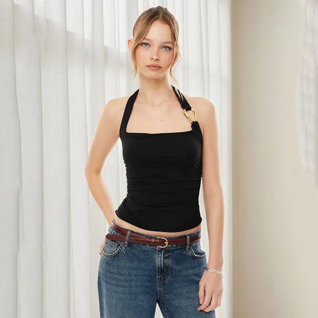 Pure Color Halter Metal Ring Vest Camisole Top - Black