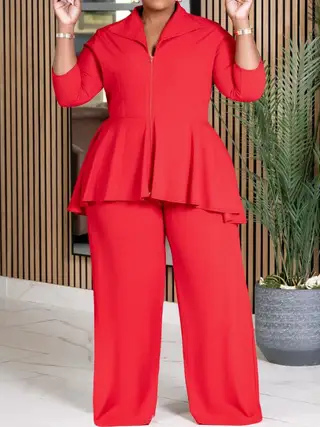 Commuter Long Sleeve Lapel Zipper Top Wide Leg Pants Solid Color Suit