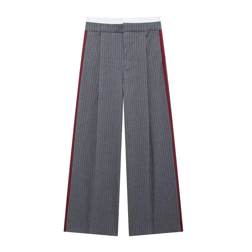 HomeBottomsWide Leg PantsPinstripe Boxer Briefs Detail High-waisted Trousers - Gray Stripe