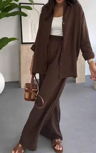 Solid Color Loose Top Wide Leg Pants Two-piece Set - Brown
