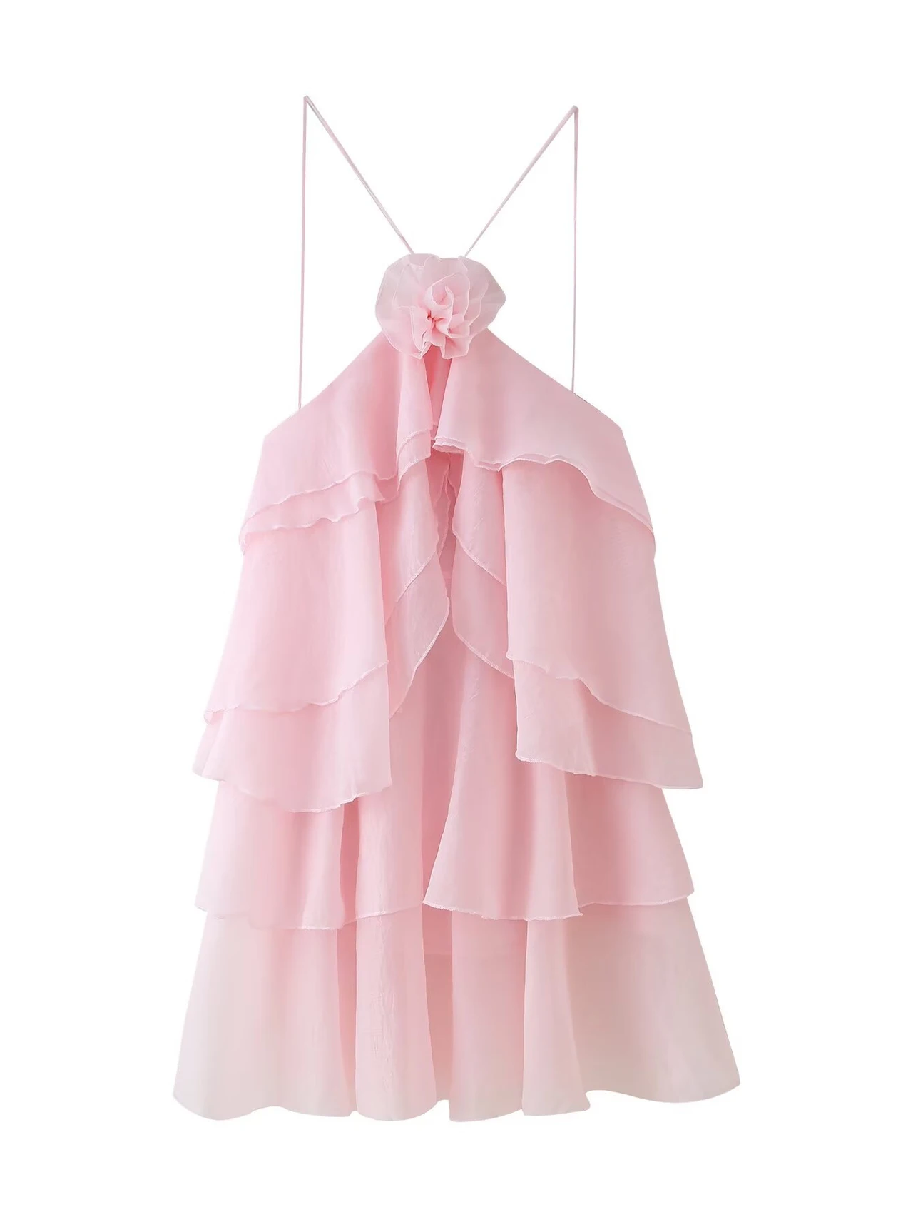 Three-dimensional Flower Decoration Laminated Ruffled Halter Dress -