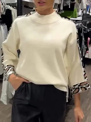 Turtleneck Long Sleeve Leopard Splicing Top -