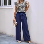 Temperament V-neck Floral Top Belt Wide Leg Pants