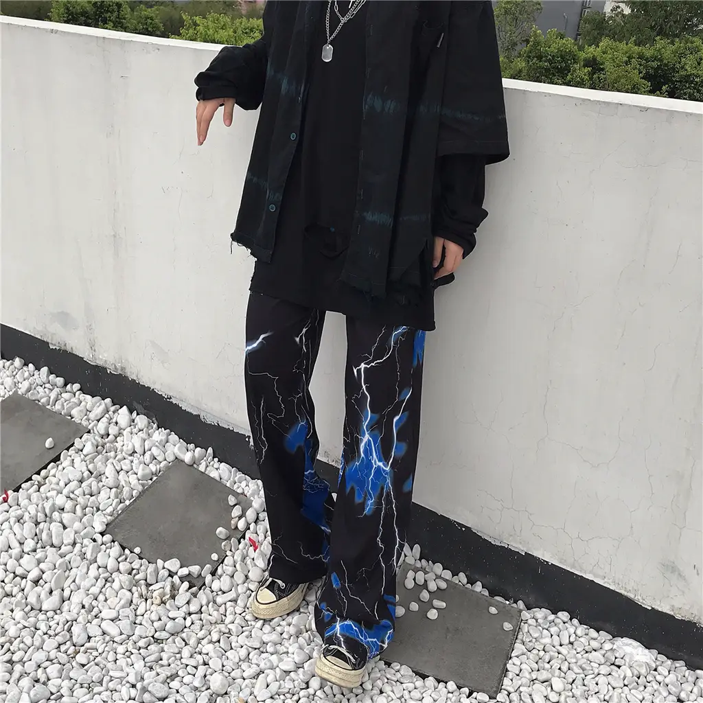 Female Harajuku Style High Dark Black Retro Lightning Print Loose -