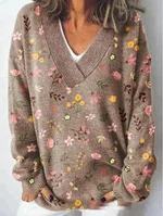Floral Pattern Printed V-neck Long Sleeve Sweatshirt - Xxs