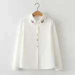 Flower Embroidered Cotton Round Neck Long Sleeve Shirt Placket Rabbit