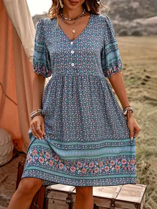 Flower Print Puff Sleeve Button Bohemian Style