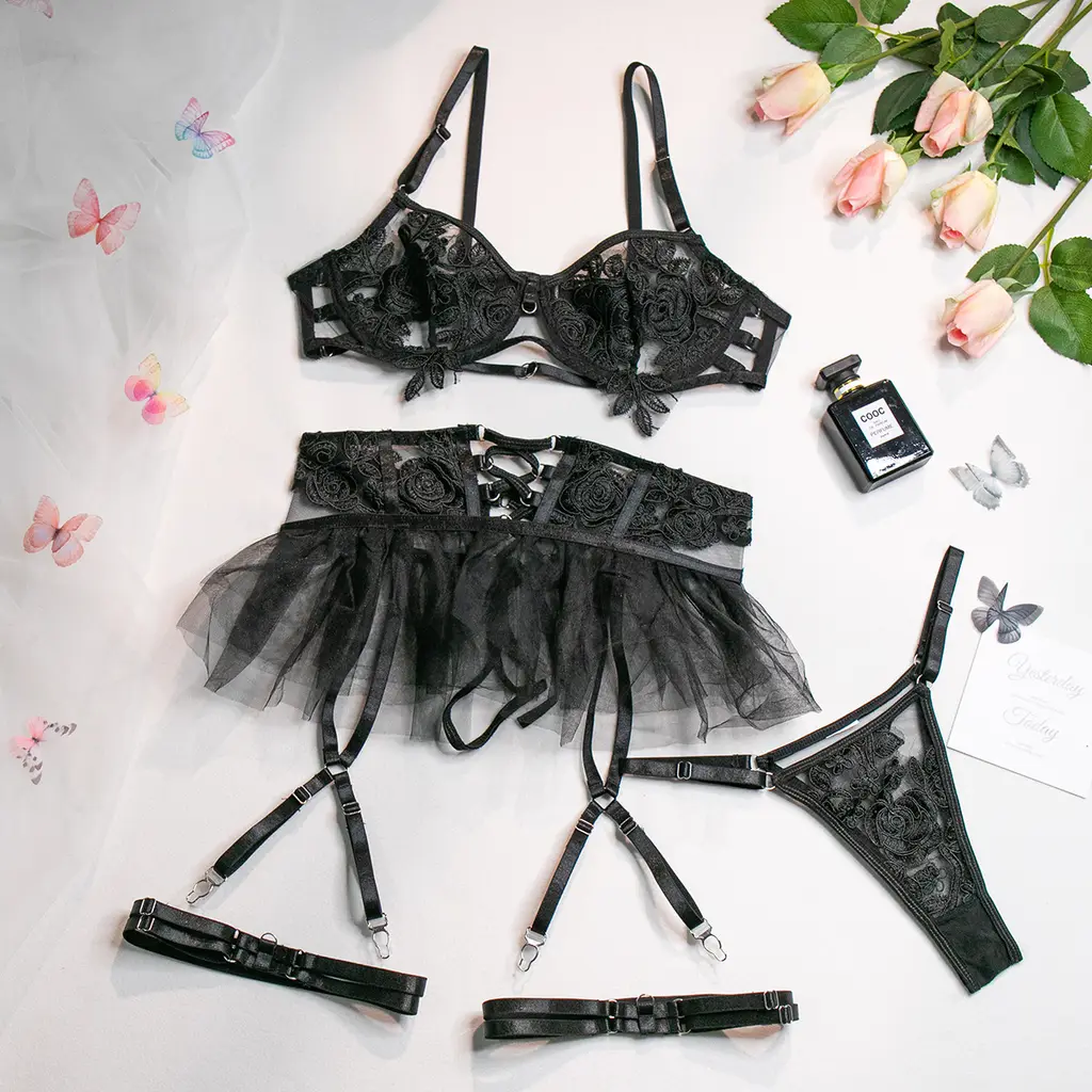 Product information: Fabric name: Lace Color: Black Main fabric composition: Polyester fiber Size: S,m,l Applicable gender: Female Style: Mesh Size: UnitCM Note: 1. Asian sizes are 1 to 2 sizes smaller than European and American people. Choose the larger size if your size between two sizes. differences due to . 2. Please check the size chart carefully before you buy the item, if you don't know how to choose size, please contact our customer service. 3.As you know, the different computers display colors differently, the color of the actual item may vary slightly from the following images. Packing list: Four-piece sexy underwear set Product Image:
