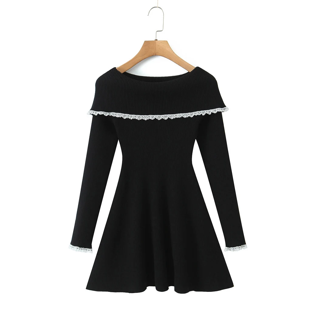 French Sexy Off-neck Lace Trim Knitted Slim-fit Sheath Dress - Black