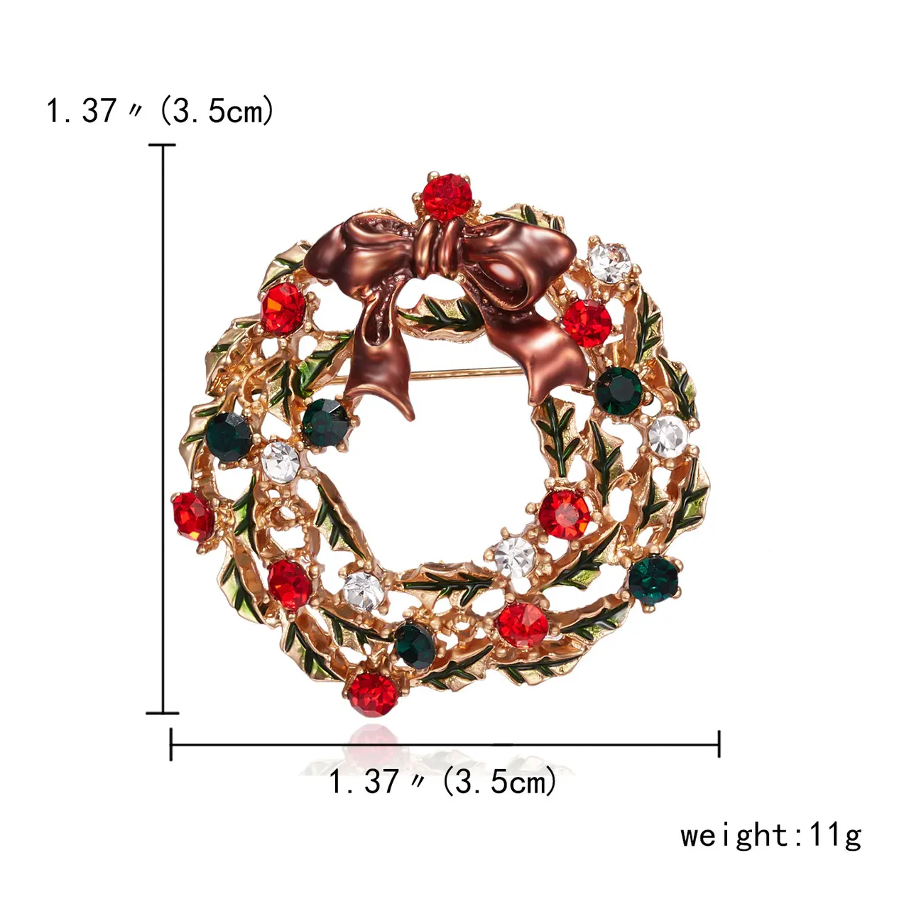 Product name: Christmas wreath brooch Material: Alloy Style: European and American Style: Unisex Style: Garland Treatment process: electroplating Applicable gift-giving occasions: travel commemoration, trade fairs, advertising promotions, employee benefits, anniversary celebrations, business gifts, opening ceremony Inlay material: rhinestone Commodity material: alloy + rhinestones + painting oil