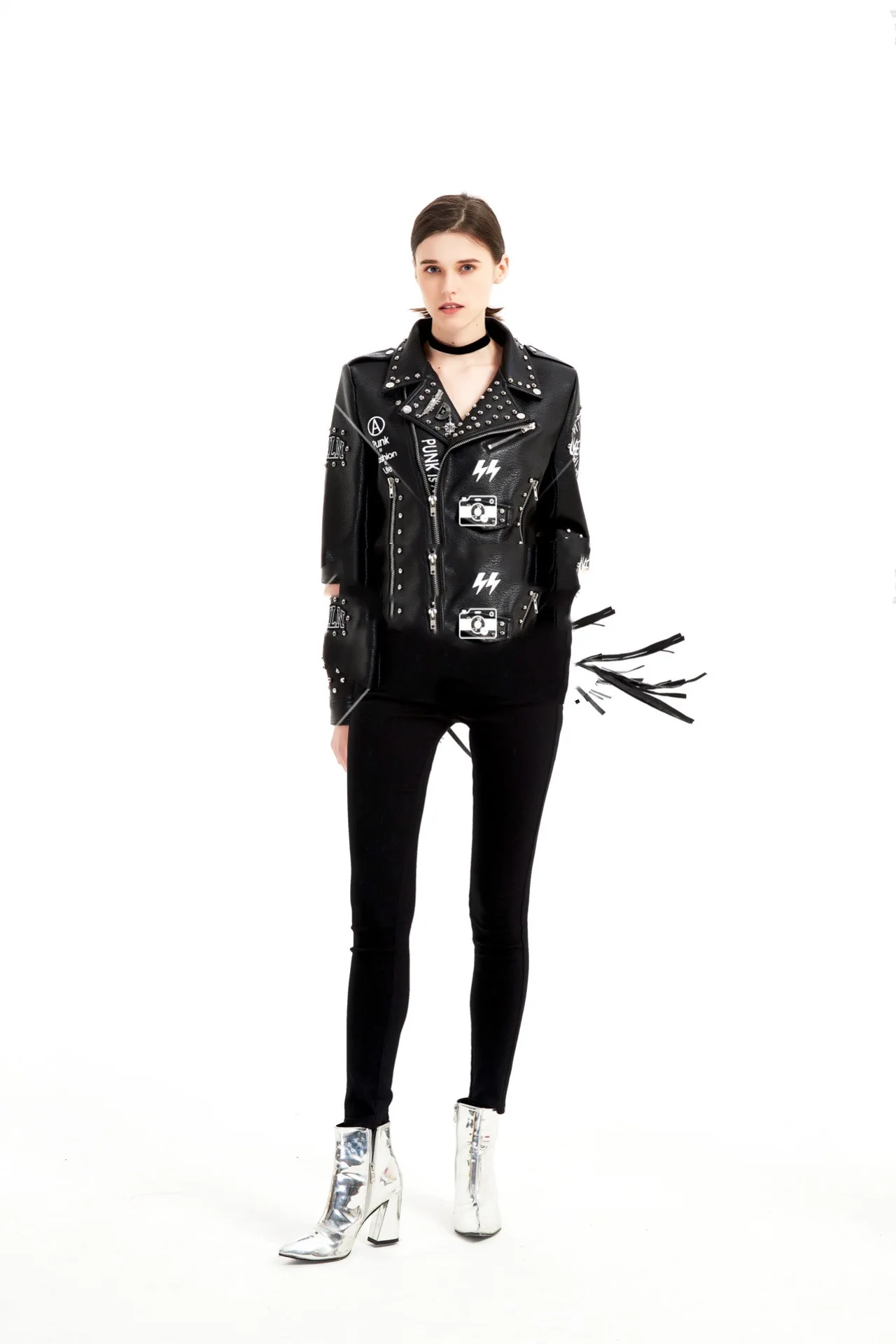 Graffiti Printed Rivet Slim Short Leather Jacket