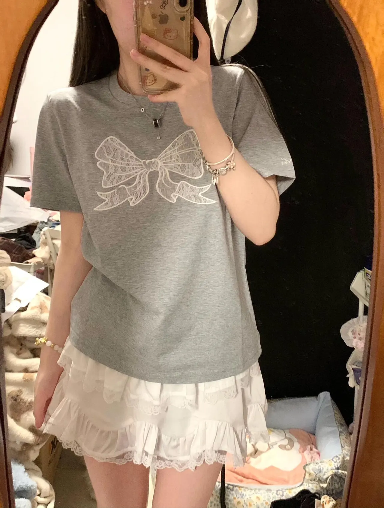 Gray Embroidered Bow Shoulder Short Sleeve - Gray