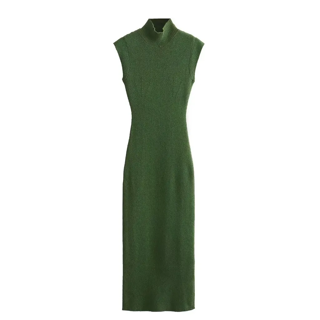 Green High Collar Sleeveless Knitted Dress Metal