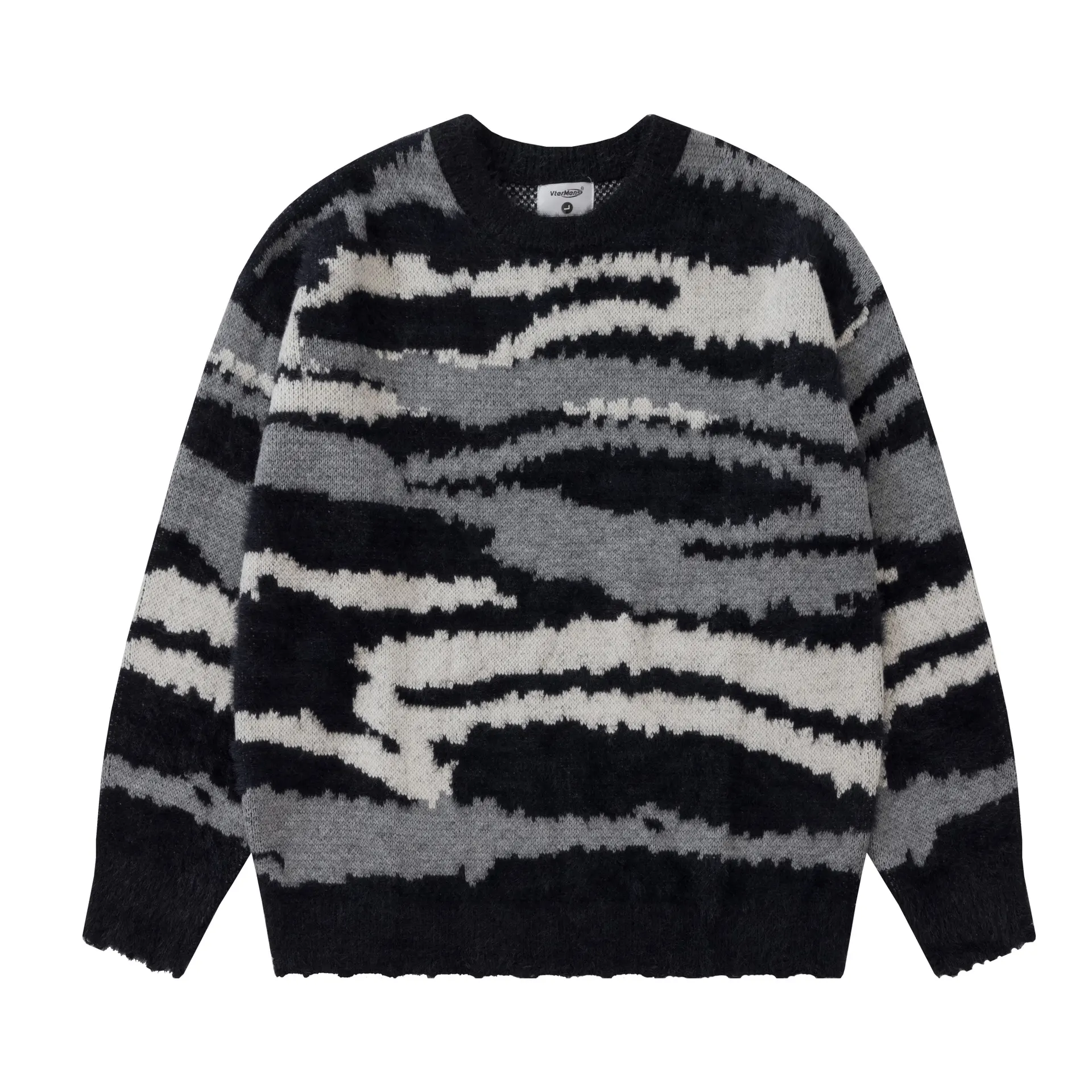 Heavy Color Matching Furry Round Neck Sweater - Black