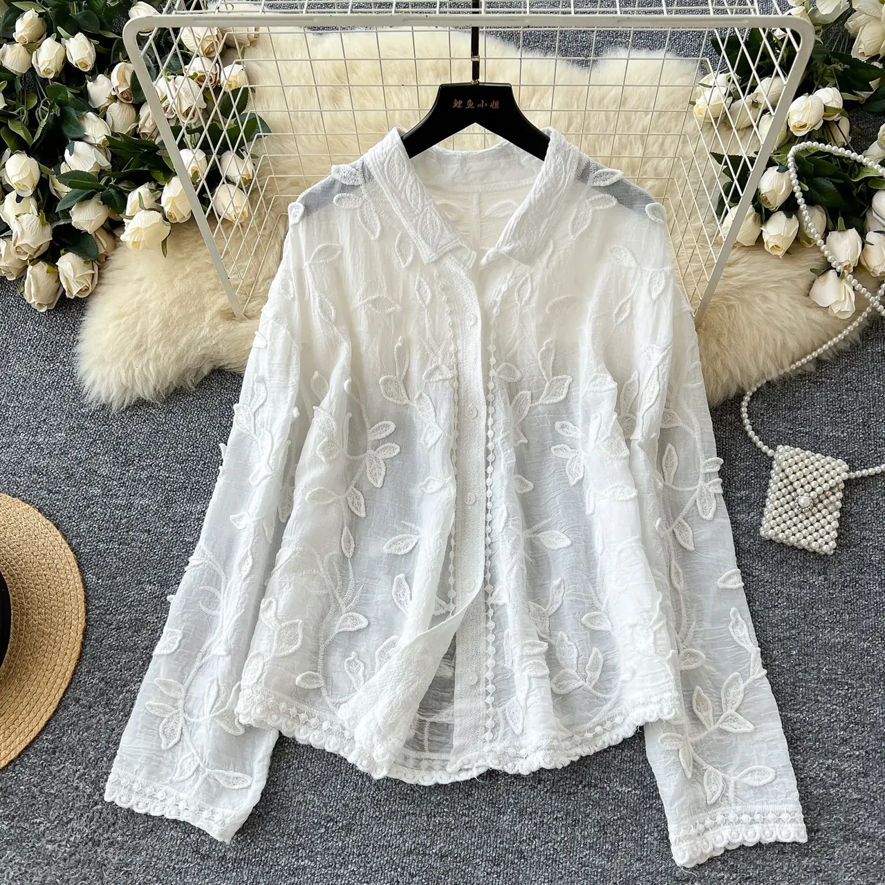 Heavy Industry Leaf Embroidery Cardigan Long Sleeve Top - White