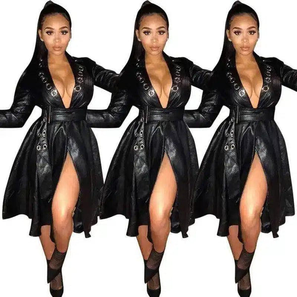 Women's Faux Leather Trench Dress with Belt