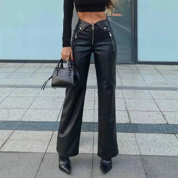 High Waist Straight Loose Wide Leg Casual Pants Leather