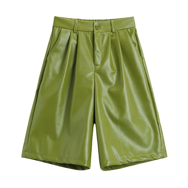 High-waisted A-line Wide-leg Slimming Loose Leather Shorts - Green