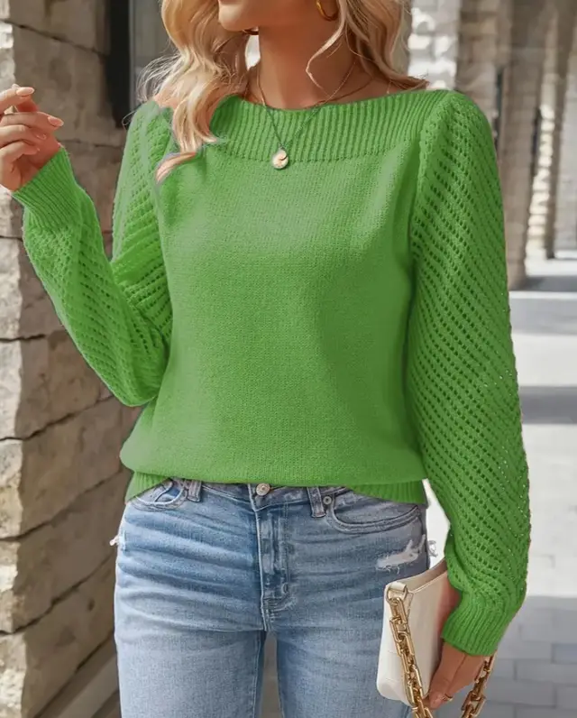 Hollow-out Long-sleeved Off-shoulder Pullover Sweater Top - Green