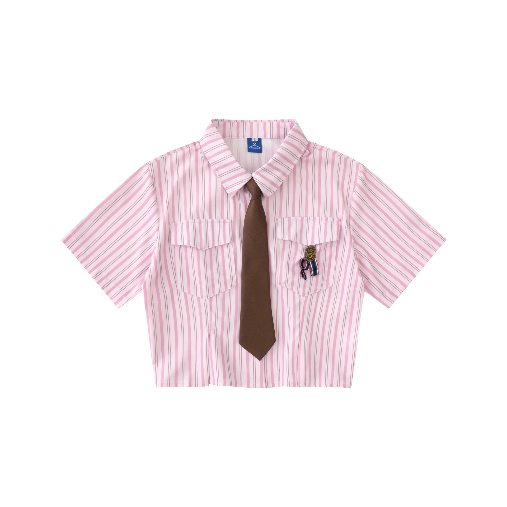 College Style Striped Tie Short Shirt - Pink