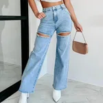 Jeans Washed Chain Ripped Straight Pants - Light