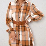 Khaki Plaid Pattern Collared Neck Ruffled Sleeve Shirt Dress - Red