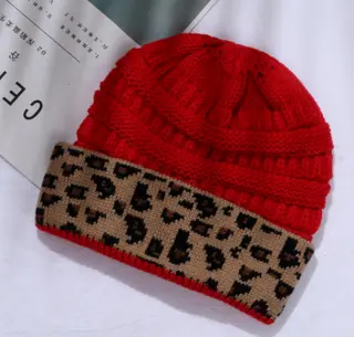 Leopard Print Cuffed Acrylic Knitted Hat - Red