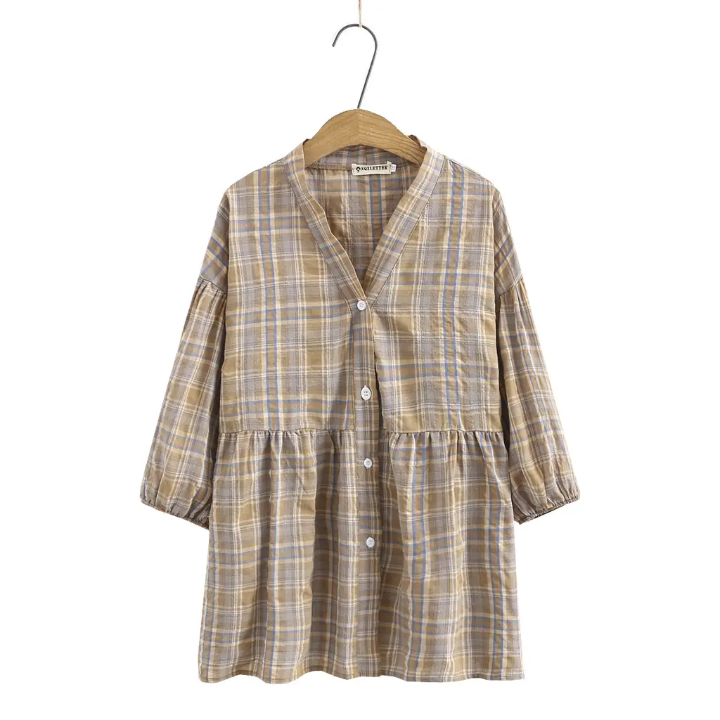 Large V-neck Plaid Shirt Spring Loose Half Seeve Top - Khaki