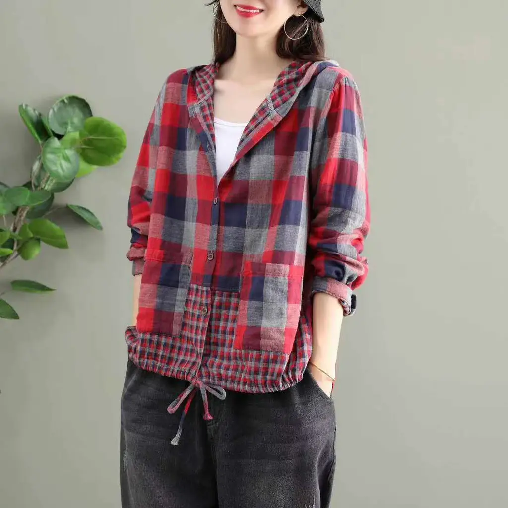 Literary Original Cotton Hooded Plaid Jacket - Red