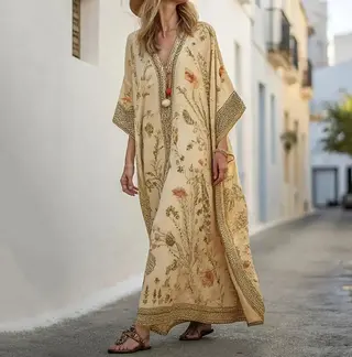Long Sleeve Kaftan Linen Vacation Maxi Dress -