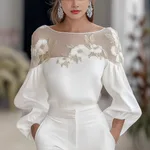 Long Sleeve Round Neck Mesh Stitching Digital Printed Chiffon Shirt