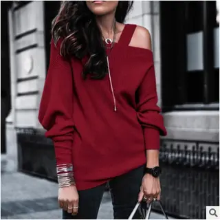 Long Sleeve Solid Color Rib Fabric Shoulder-baring Sweater Sweater -