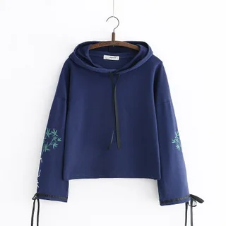 Loose Flared Sleeve Embroidered Hooded Sweatshirt - Navy Blue