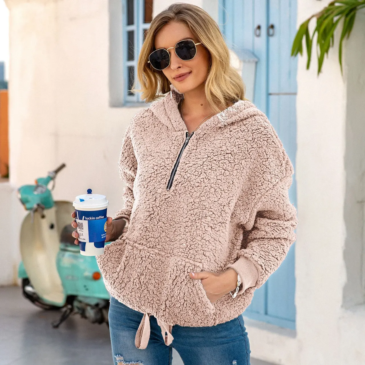 Loose Plush Pullover Socket Solid Color Sweater Coat Clothing - Pink